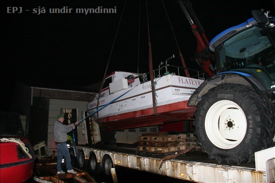 Rétt fyrir kl. 8 í morgun renndi Elvar Kristinn Sigurgeirsson, í hlað hjá Sólplasti í Sandgerði, en hann ekur á flutningavagni frá Þotunni í Bolungarvík. Að þessu sinni var hann að koma með bátinn 6669. Maríu ÍS 777, frá Flateyri, sem varð fyrir því óhappi að sigla á trjádrumt, en hann var á sjó og skemmdist báturinn nokkuð og því var honum nú ekið landleiðis til Sólplasts til viðgerðar. Þar komu við sögu Björn Marteinsson sem var með kranabíl og lyfti bátnum bátnum af flutningavagninum og á bátavagn. Einnig koma þarna að sjálfsögðu til sögunnar Kristján Nielsen, hjá Sólplasti. Allt um það á þessari myndasyrpu sem ég tók í morgun, en á henni sést báturinn, bíll Björns og mennirnir þrír sem rætt eru, hluti af skemmdinni á bátnum o.fl.