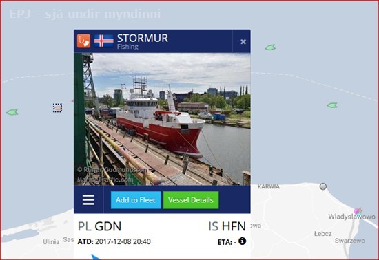 2926. Stormur HF 294, á heimleið, fór frá Póllandi kl. 20.40 í gær © skjáskot af MarineTraffic, í morgun 9.12.2017 kl. 7.07
