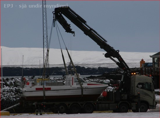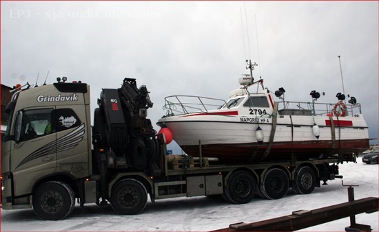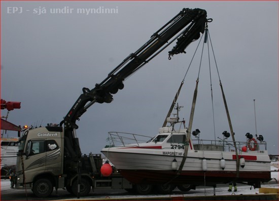Hér kemur smá syrpa sem sýnir flutning á Margréti HF 4, í dag og þrjár fyrstu myndirnar tók ég í Grófinni, Keflavík er báturinn var hífður upp og settur á flutningapallinn sem hann stóð á til Sandgerðis. Þá sjáum við þegar báturinn er kominn í bátakerru og í henni var báturinn settur strax inn í hús hjá Sólplasti.