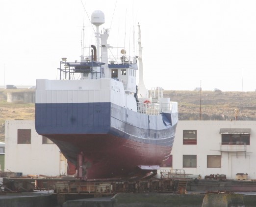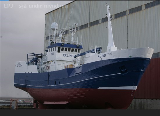 Erling KE 140. í sleðanum á leið niður úr Skipasmíðastöð Njarðvíkur í dag