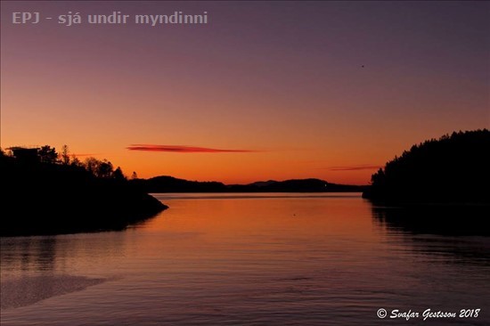 Sólarupprás í sundinu milli eyjanna Sotra og Litlesotra. Bjornøyna á milli út við ystu sjónarrönd