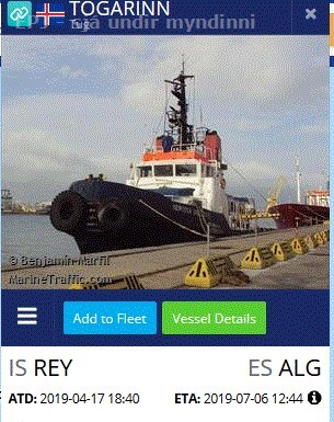 2823. Togarinn, er nú á leið til Spánar og þá vaknar sú spurning hvort búið sé að selja hann þangað? Eins og fran kom hér á síðunni fyrir nokkrum dögum, keyptu eigendur Togarans öfluga dráttarbáta hingað til lands og birti ég mynd af öðrum þeirra, en sá heitir Grettir sterki - EITTHVAÐ HEFUR KOMIÐ UPP Á ÞVÍ SAMKVÆMT MARINETRAFFIC, ER TOGARINN KOMINN AFTUR TIL REYKJAVÍKUR |
